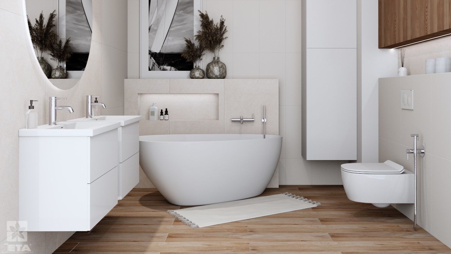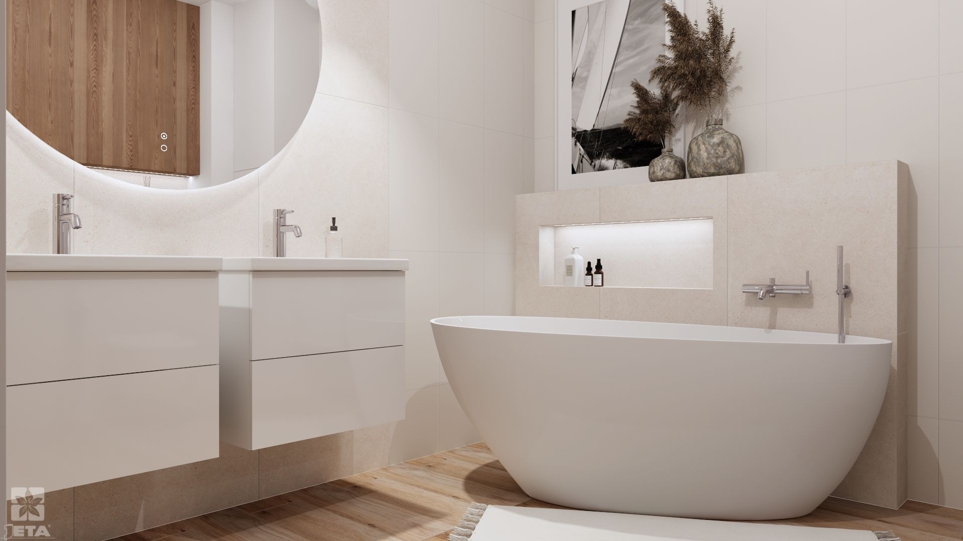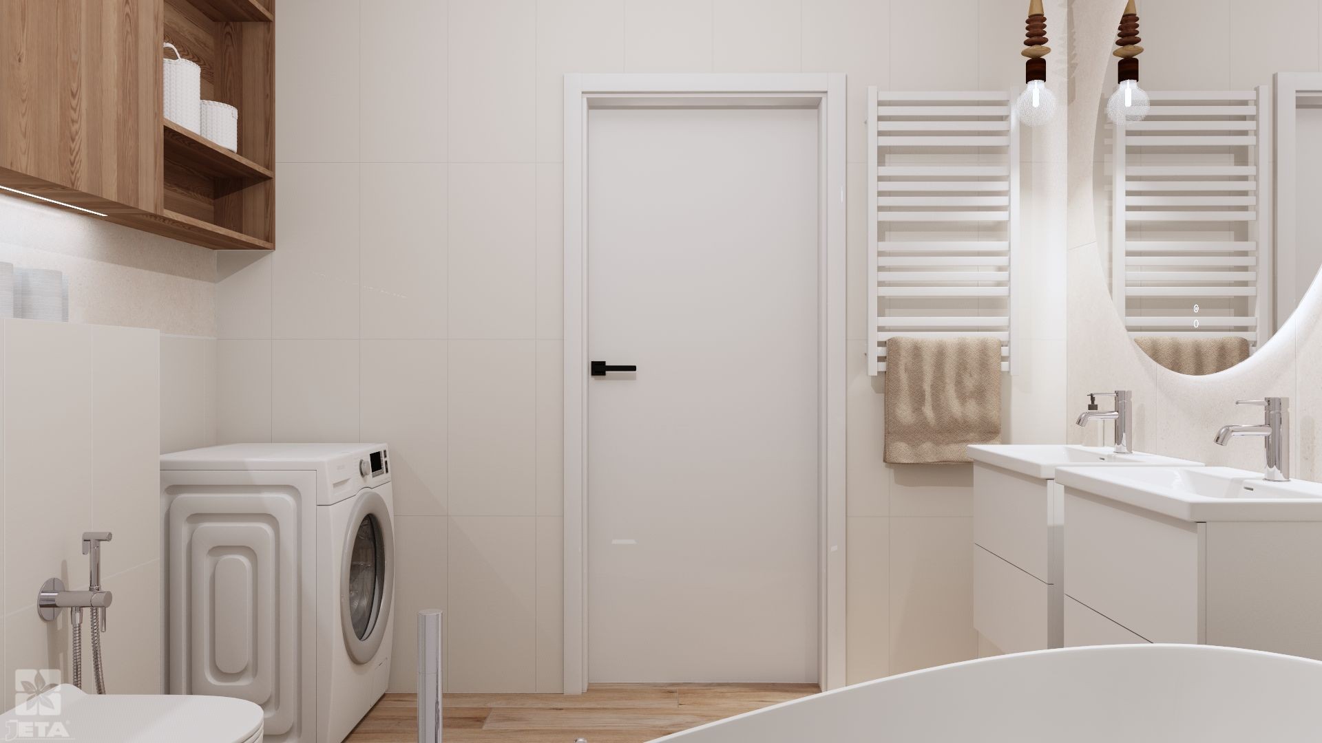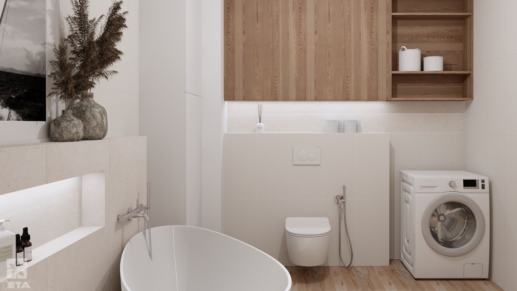Jasne, przytulne wnętrze w skandynawskim stylu z subtelnym akcentem boho. Połączenie naturalnego drewna z bielą i beżem tworzy harmonijną, ciepłą przestrzeń, sprzyjającą relaksowi. Wolnostojąca wanna, otoczona minimalistycznymi dodatkami, dodaje elegancji i podkreśla funkcjonalność wnętrza. Wiszące lampy z drewnianymi detalami oraz dekoracyjne trawy w wazonach nawiązują do natury, wprowadzając przyjemną, organiczną atmosferę. Geometryczne formy, proste linie i przemyślane detale nadają całości nowoczesnego, ale jednocześnie przytulnego charakteru. Idealna przestrzeń dla miłośników minimalizmu z nutą naturalnej estetyki.
