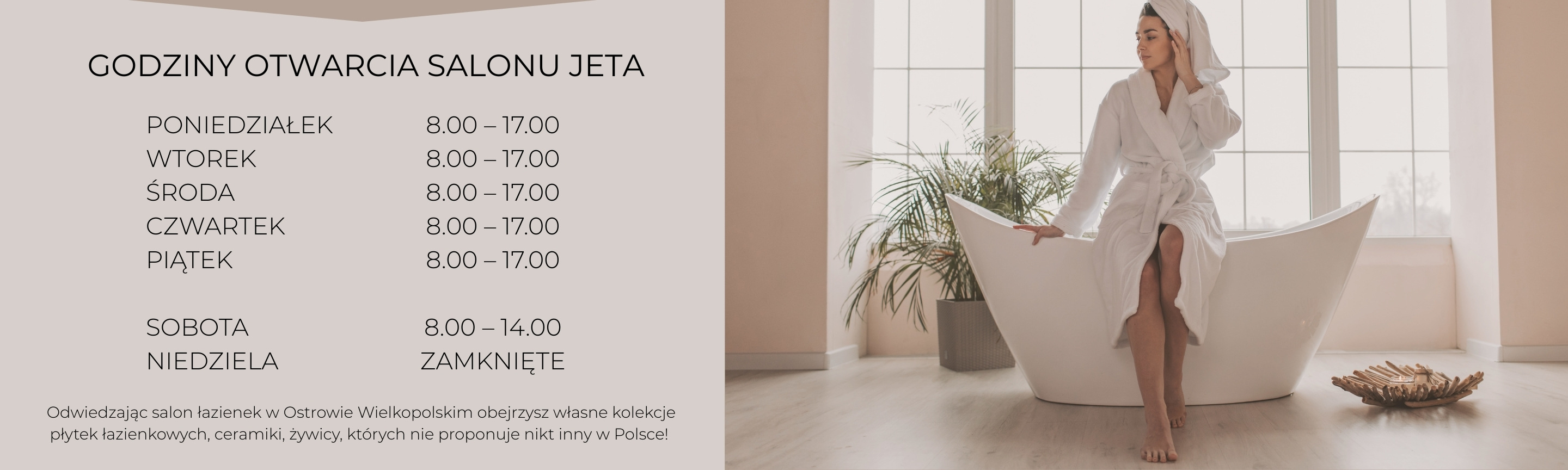 Doświadczony zespół doradców pomaga w wyborze produktów, przygotowaniu kompletacji i dopasowaniu elementów do aranżacji. Dzięki połączeniu salonu z logistyką oraz zapleczem firmowym JETA jest jednym z najlepiej zaopatrzonych punktów typu sklep z wyposażeniem łazienek, oferującym wysoką dostępność produktów, atrakcyjne ceny i kompleksową obsługę.