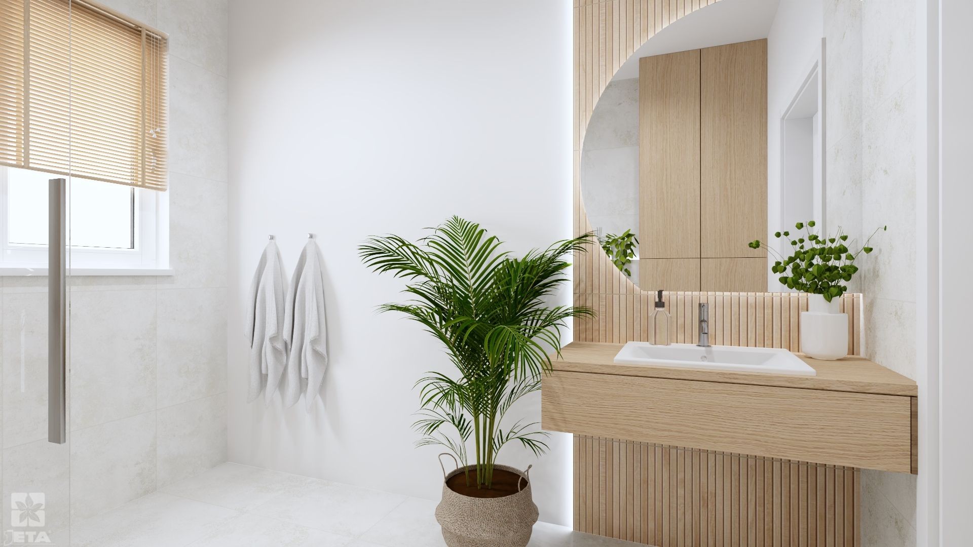 Połączenie minimalizmu i naturalnych akcentów tworzy przestrzeń inspirowaną filozofią Japandi. Jasne płytki na ścianach i podłodze optycznie powiększają wnętrze, a drewniane panele wprowadzają ciepło i harmonię. Naturalna roślinność dodaje świeżości, podkreślając spokój tej aranżacji. Wisząca szafka umywalkowa o prostym designie oraz lustro z podświetleniem LED łączą estetykę z funkcjonalnością. Przestronna kabina prysznicowa i subtelne detale, jak matowe baterie, dopełniają nowoczesny, ale przytulny charakter wnętrza.