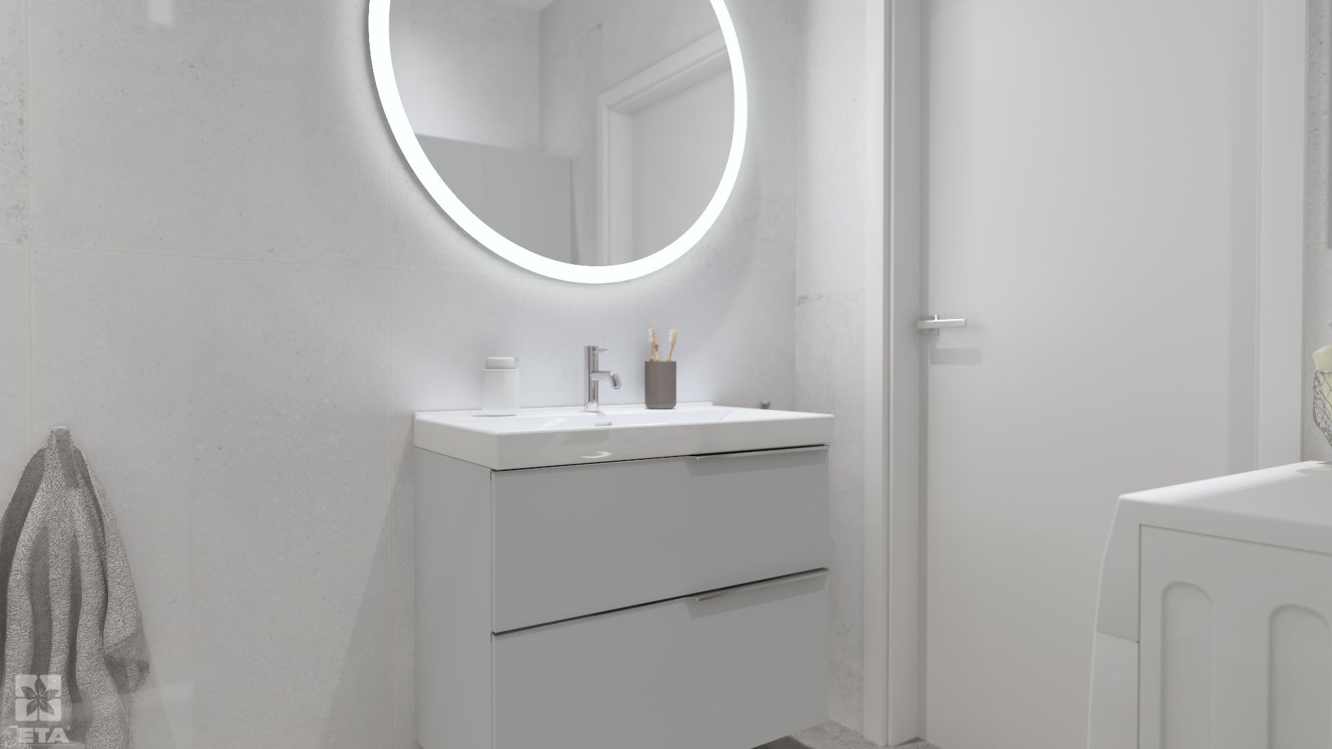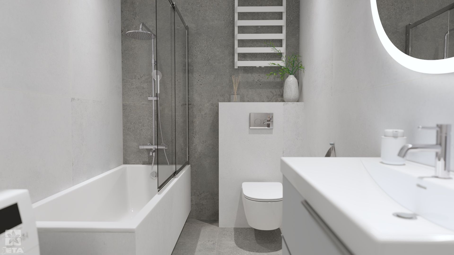 Minimalizm, harmonia i subtelna elegancja – oto łazienka, która zachwyca swoją prostotą. Wyjątkowy duet gresów Cement Taupe i Antracite tworzy łagodny kontrast, podkreślając nowoczesny charakter aranżacji. Chromowane detale oraz przemyślany układ przestrzeni dodają wnętrzu lekkości. Praktyczna wanna z parawanem nawannowym świetnie sprawdzi się podczas kąpieli i szybkiego prysznica. Duże lustro Arcus LED optycznie powiększa przestrzeń, nadając jej przytulności i świeżości. Wisząca szafka Look o matowym wykończeniu podkreśla minimalistyczny styl. To łazienka, w której królują spokój, funkcjonalność i wysmakowana estetyka, doskonale pasująca do nowoczesnych domów i mieszkań.