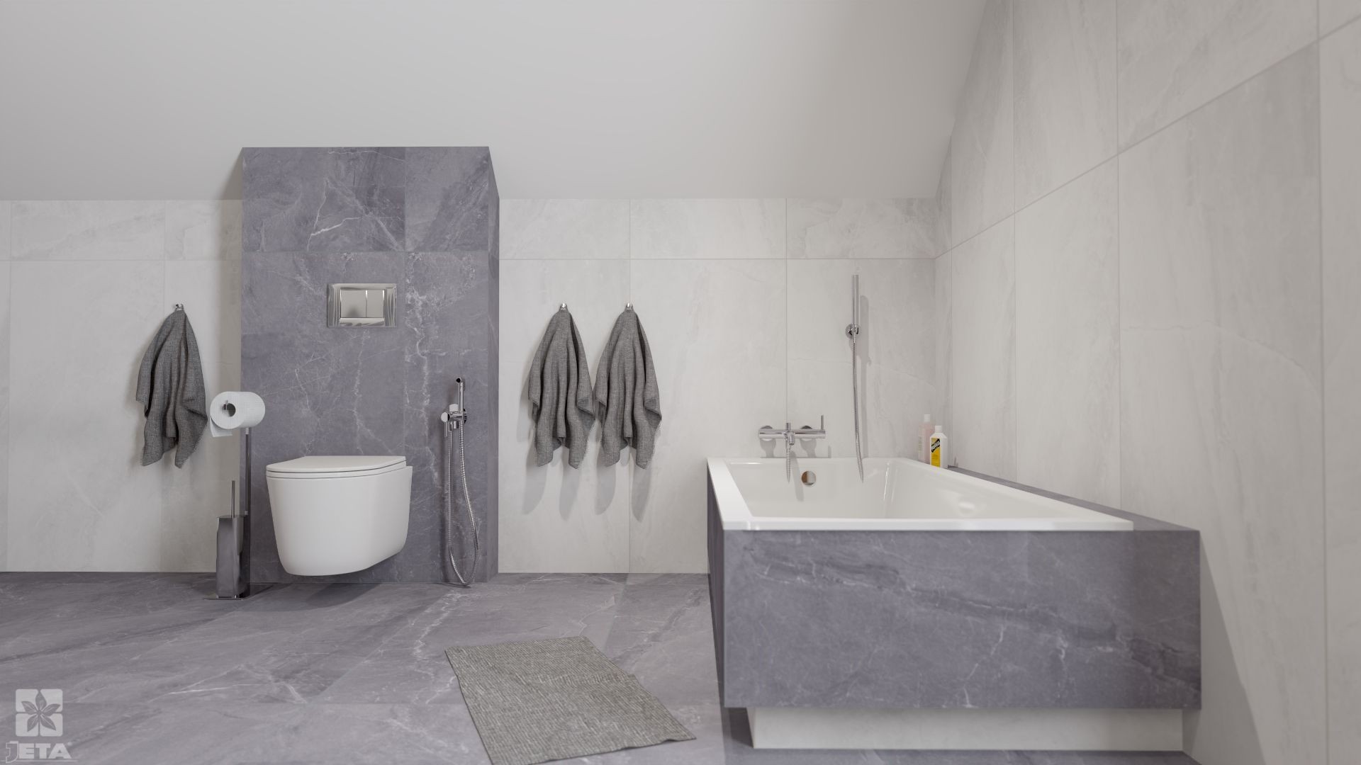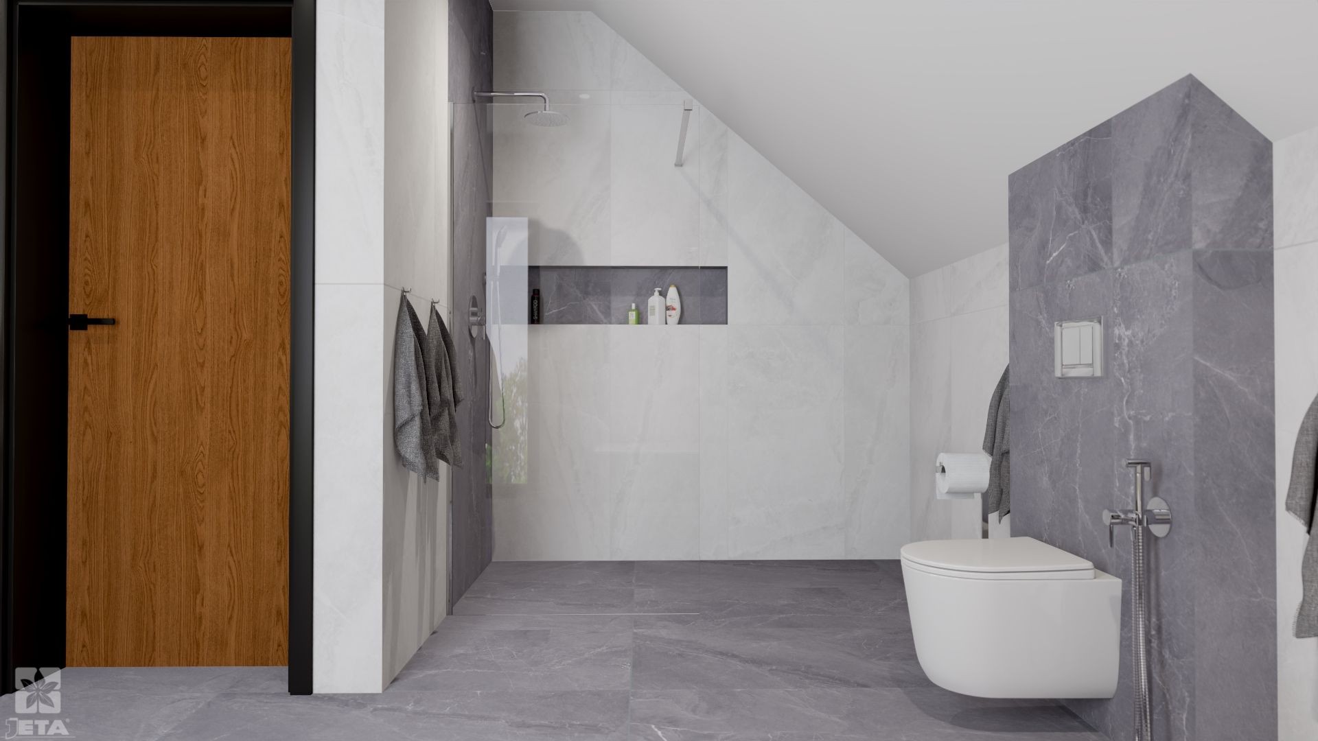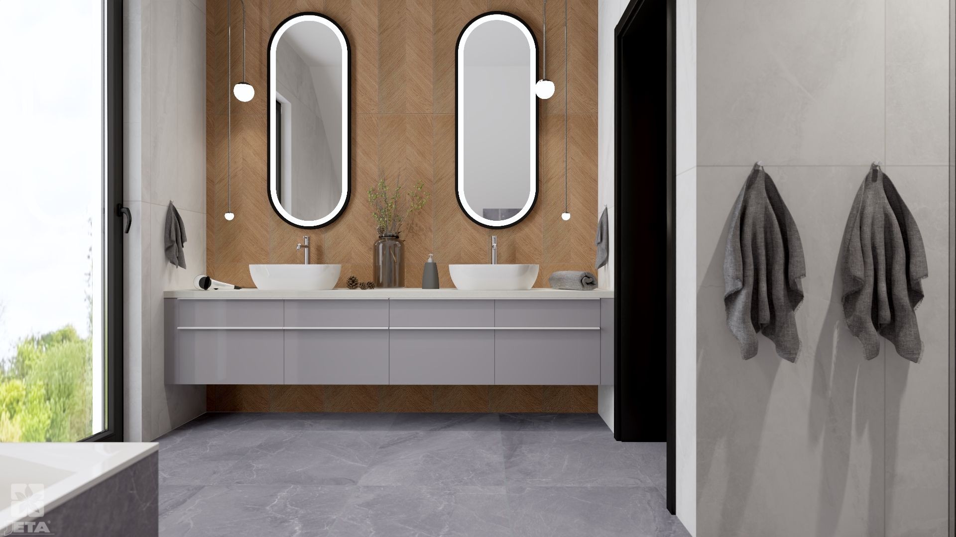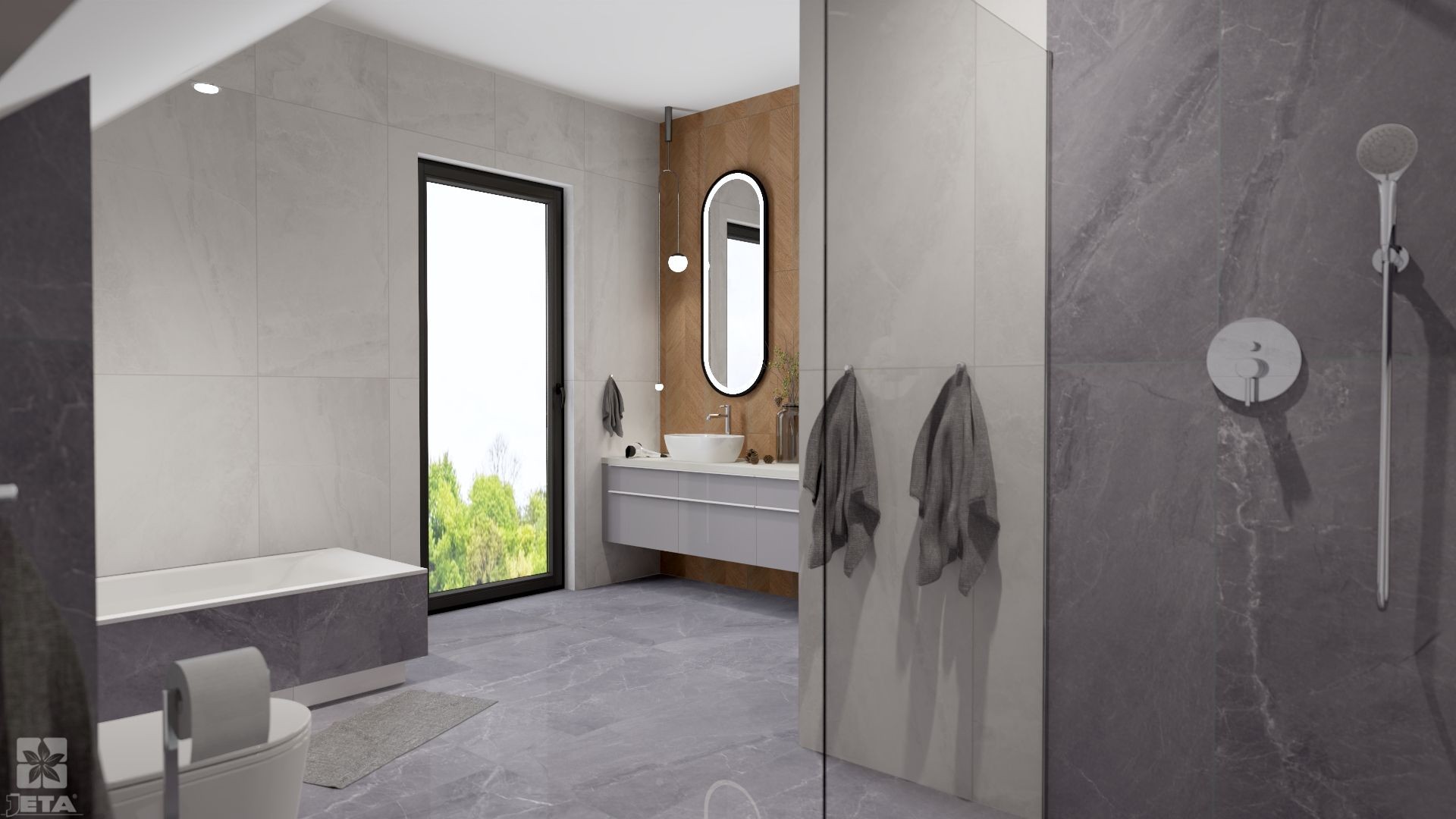 Wyjątkowa łazienka, w której nowoczesność łączy się z ciepłem naturalnego drewna. Ściany ozdobione płytkami SEDONA WOOD tworzą relaksujący klimat, pięknie kontrastując z półpolerowanymi płytkami TIOGA w kolorze białym i ciemnoszarym. Prostokątna wanna SAVAI SLIM marki Roca zapewnia komfort SPA, a stylowa bateria wannowa Omnires Y1230CR z eleganckimi chromowanymi detalami podkreśla luksusowy charakter wnętrza. Kabina prysznicowa MODO II NEW od Radaway oraz nowoczesne systemy podtynkowe Omnires zapewniają maksymalny komfort użytkowania. Całość aranżacji uzupełnia miska WC SOME Interno i umywalka nablatowa Bella, dodając wnętrzu harmonii i funkcjonalności.