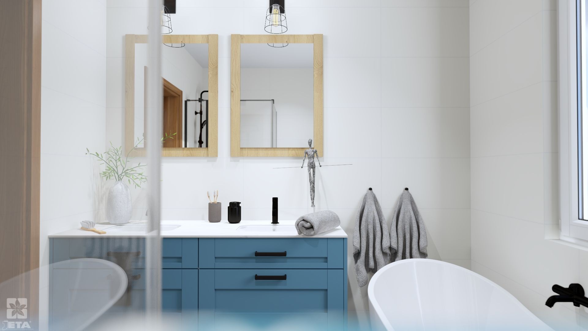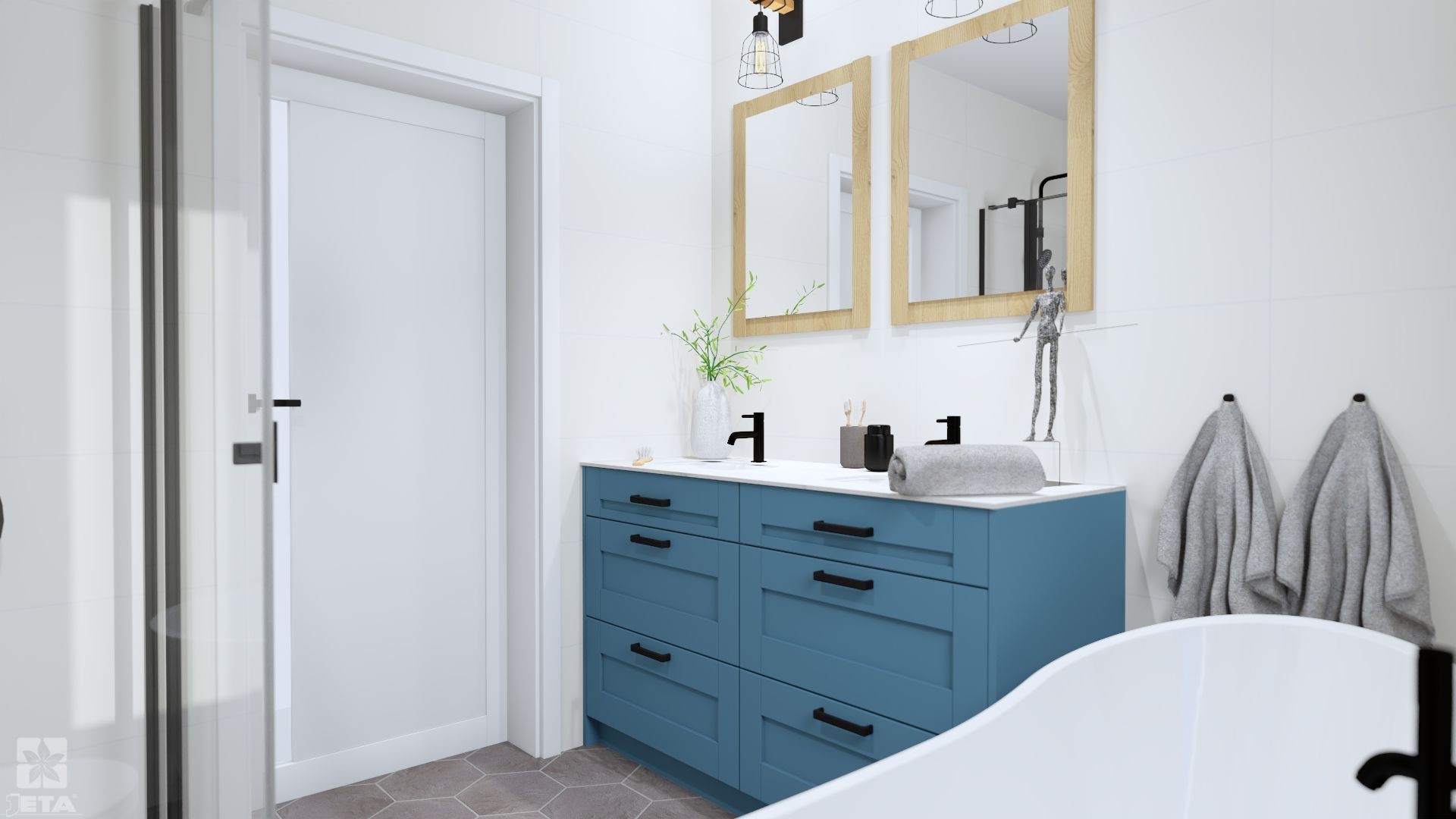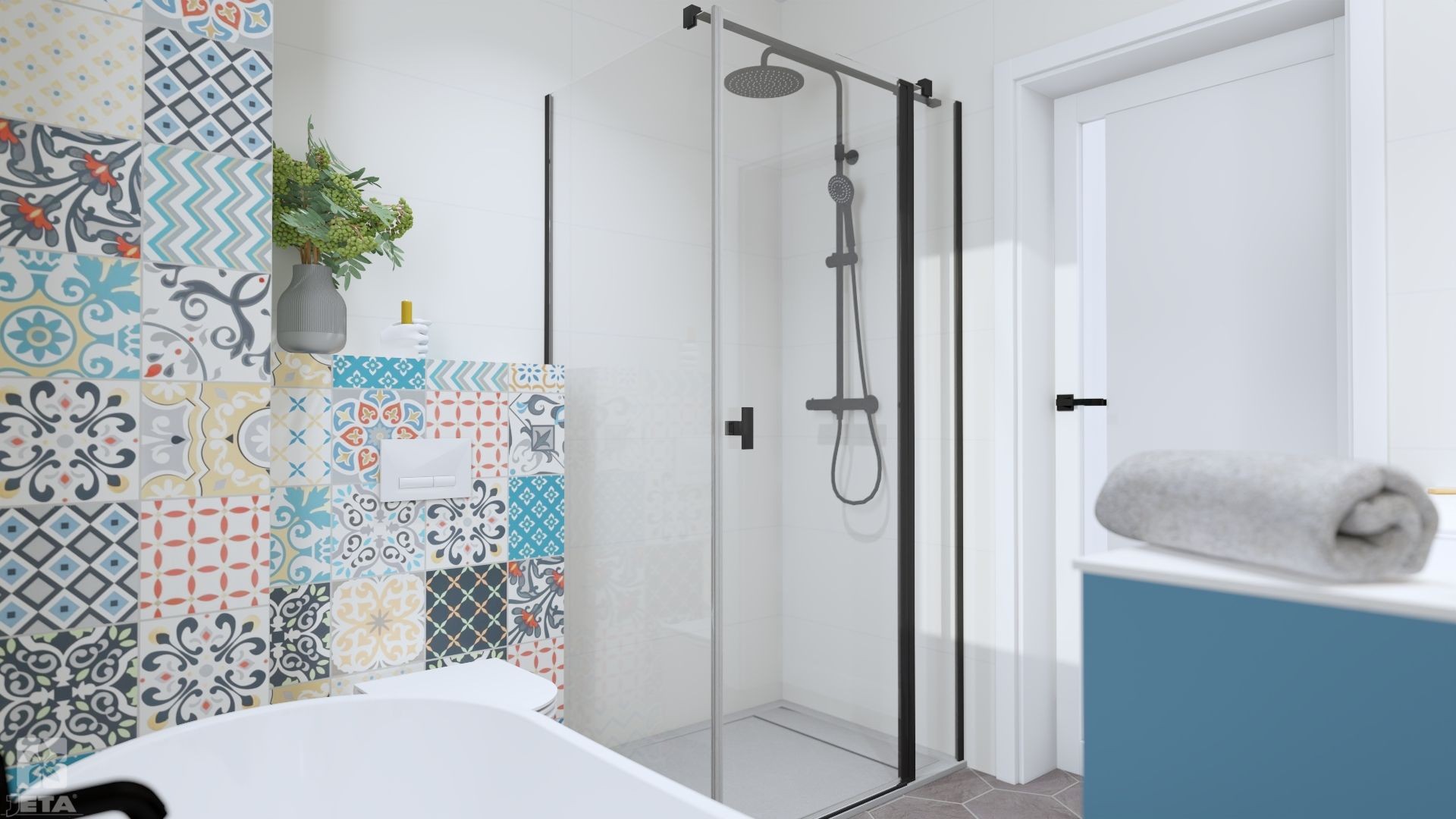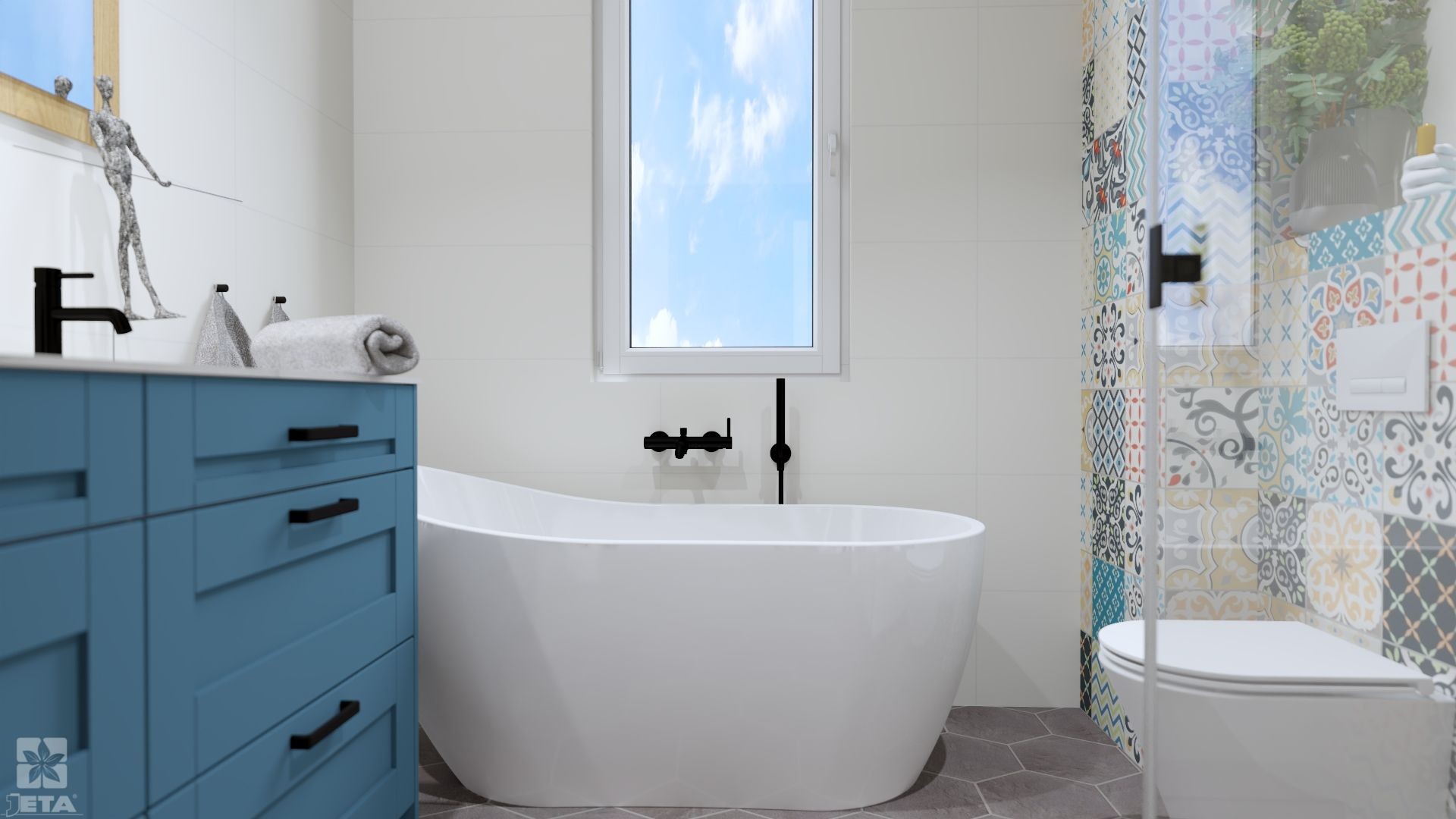 Nowoczesna łazienka łączy minimalizm z odważnymi akcentami. Dominująca biel podkreśla przestrzeń, a kolorowa mozaika wprowadza energię i styl boho. Wolnostojąca wanna o eleganckiej linii nadaje wnętrzu luksusowy charakter. Czarna armatura kontrastuje z jasnym tłem, tworząc efektowny design. Niebieska szafka z frezowanymi frontami dodaje ciepła i oryginalności. Prysznic ze szklaną kabiną i deszczownicą zapewnia funkcjonalność. Całość uzupełniają drewniane lustra oraz nowoczesne oświetlenie. Idealne rozwiązanie dla osób ceniących harmonię estetyki i komfortu.