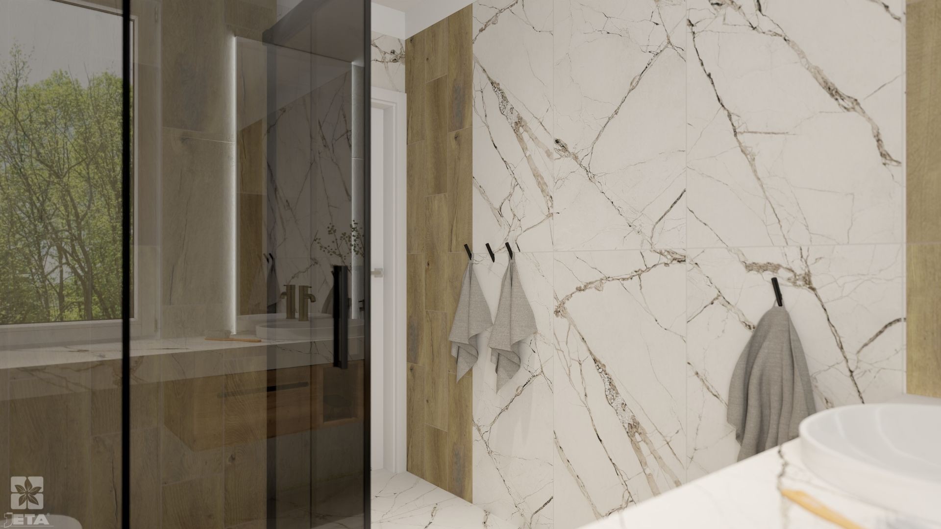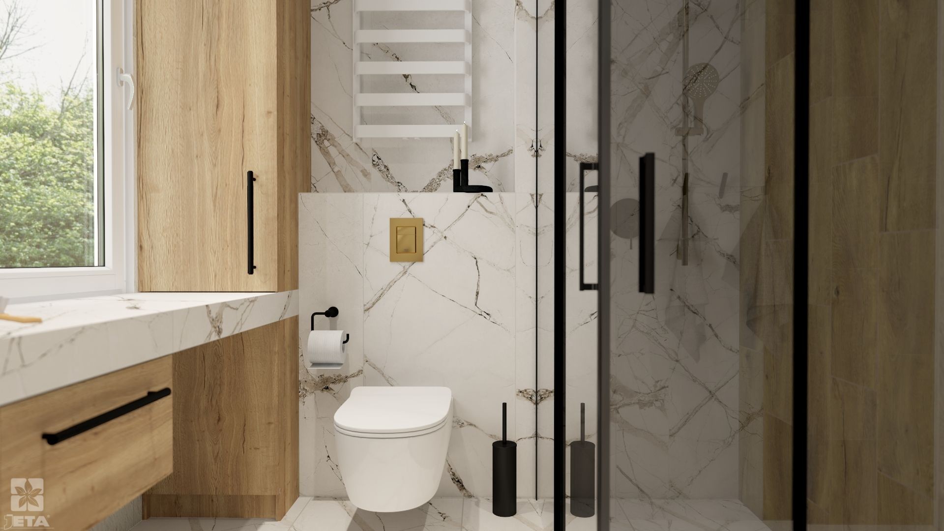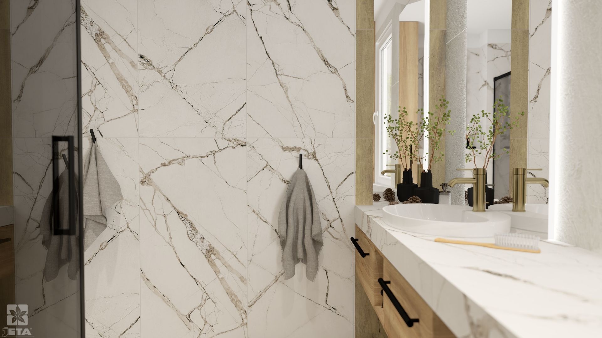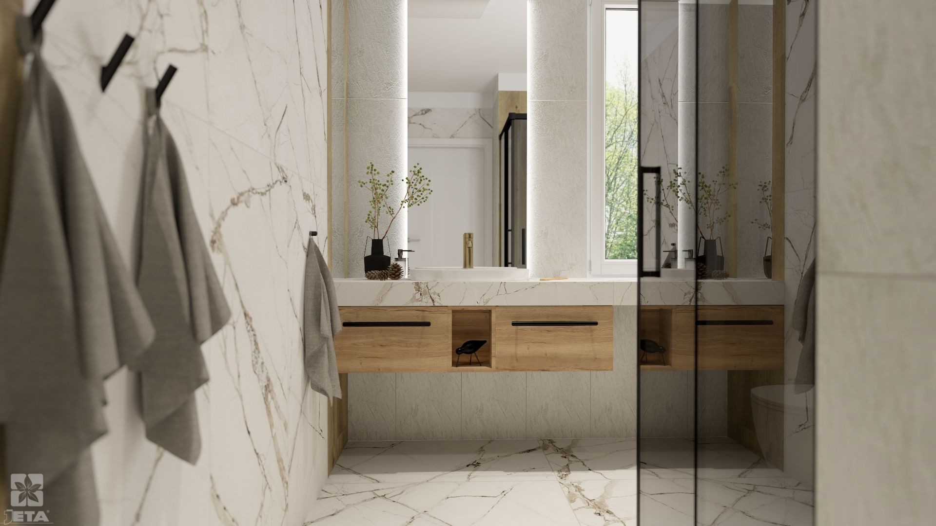 Nowoczesna łazienka z eleganckim marmurem i ciepłym drewnem to idealne połączenie funkcjonalności i stylu. Jasne płytki inspirowane marmurem optycznie powiększają przestrzeń, a czarne akcenty – w postaci armatury, uchwytów i profili kabiny – dodają industrialnego charakteru. Drewniane meble ocieplają wnętrze, tworząc harmonijną kompozycję. Oświetlenie LED wokół lustra zapewnia przyjemną atmosferę i podkreśla nowoczesny design. To elegancka łazienka dla osób ceniących minimalizm, ale z nutą luksusu. Sprawdź więcej inspiracji na jeta.pl i znajdź idealne rozwiązanie dla swojego wnętrza!
