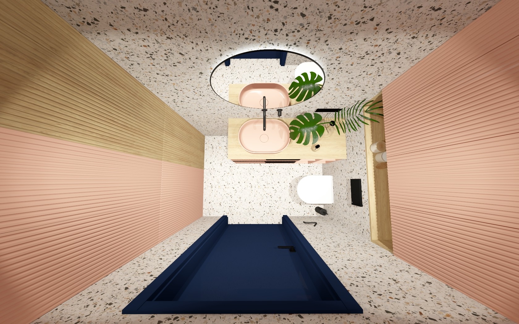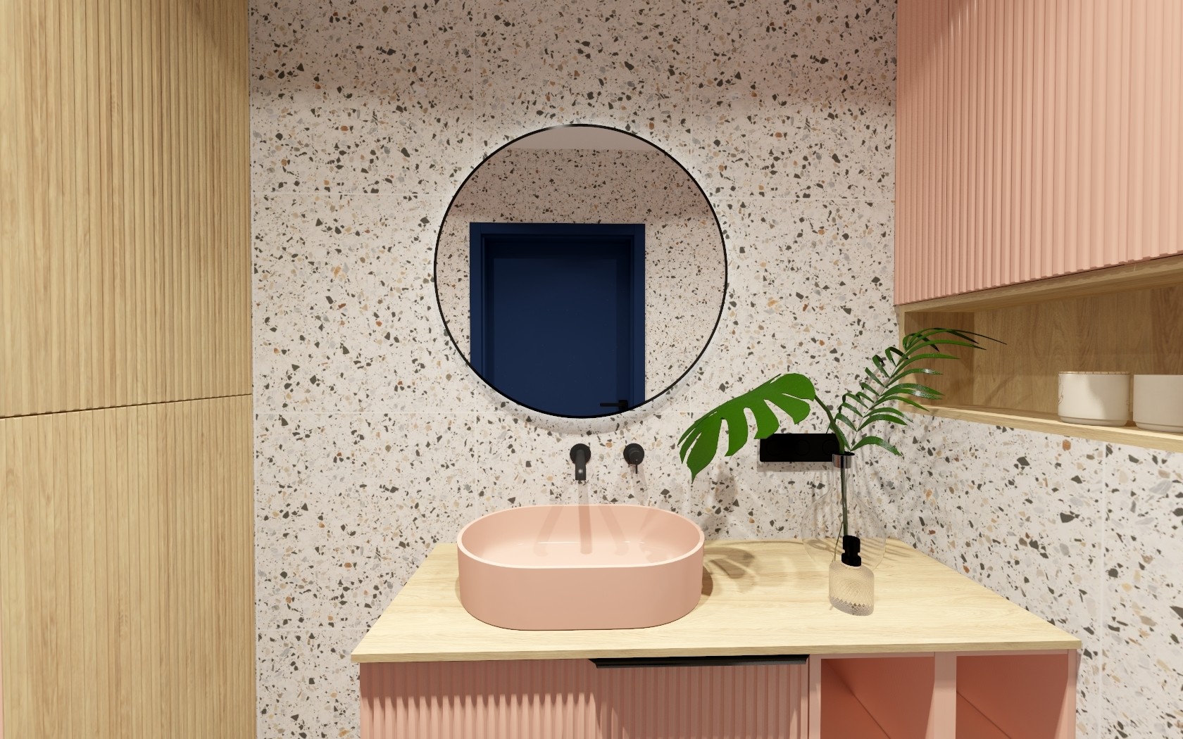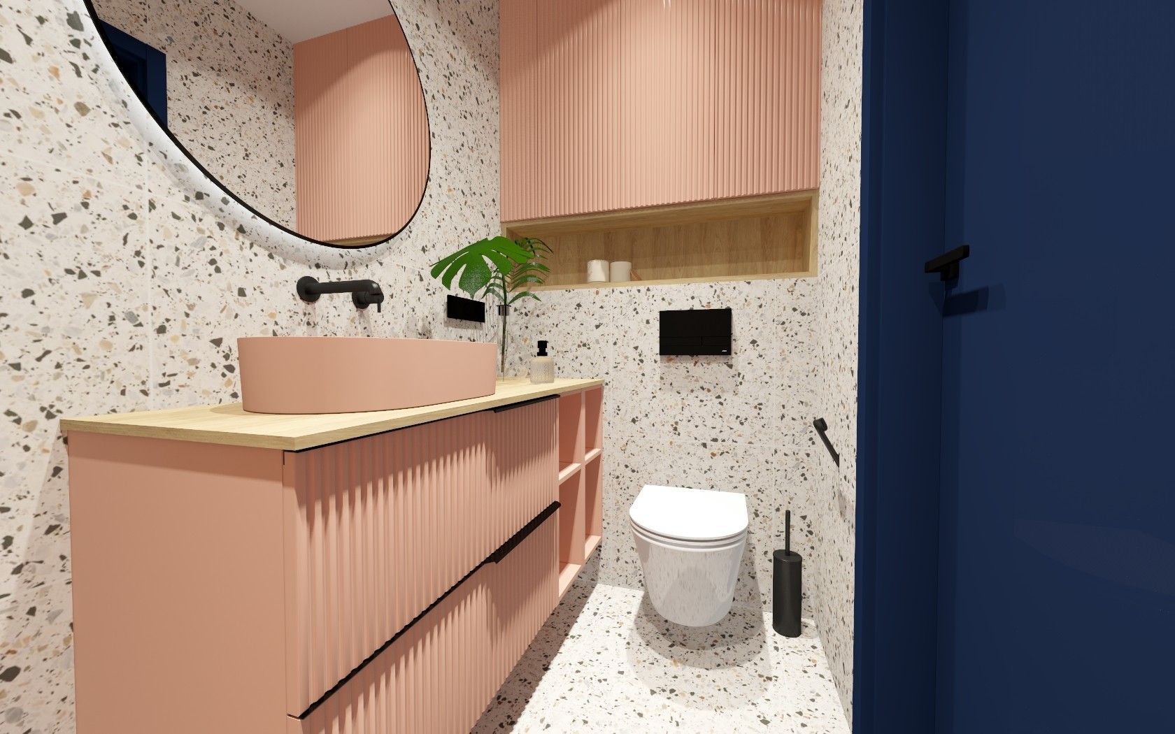 Nowoczesna łazienka w stylu terrazzo łączy oryginalny design z funkcjonalnością. Ściany wykończone terazzo w naturalnej kolorystyce idealnie komponują się z pastelowym różem szafki i umywalki oraz kontrastującym granatem drzwi. Delikatne, pionowe frezowania frontów dodają elegancji, a czarne detale, jak armatura czy uchwyty, podkreślają nowoczesny charakter wnętrza. Jasne drewno ociepla aranżację, tworząc przytulny klimat. To idealne rozwiązanie dla osób ceniących stylowe, ale praktyczne wnętrza, w których każdy detal ma znaczenie. Zainspiruj się i stwórz własną łazienkę marzeń!