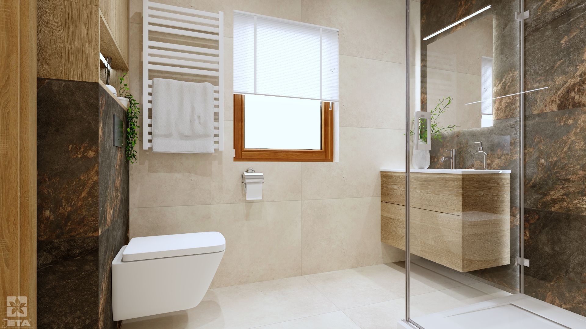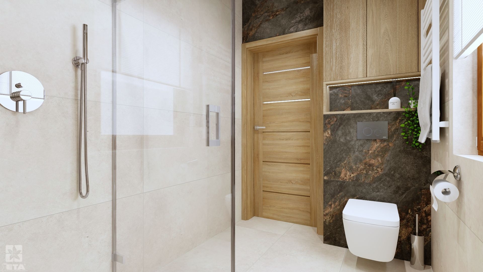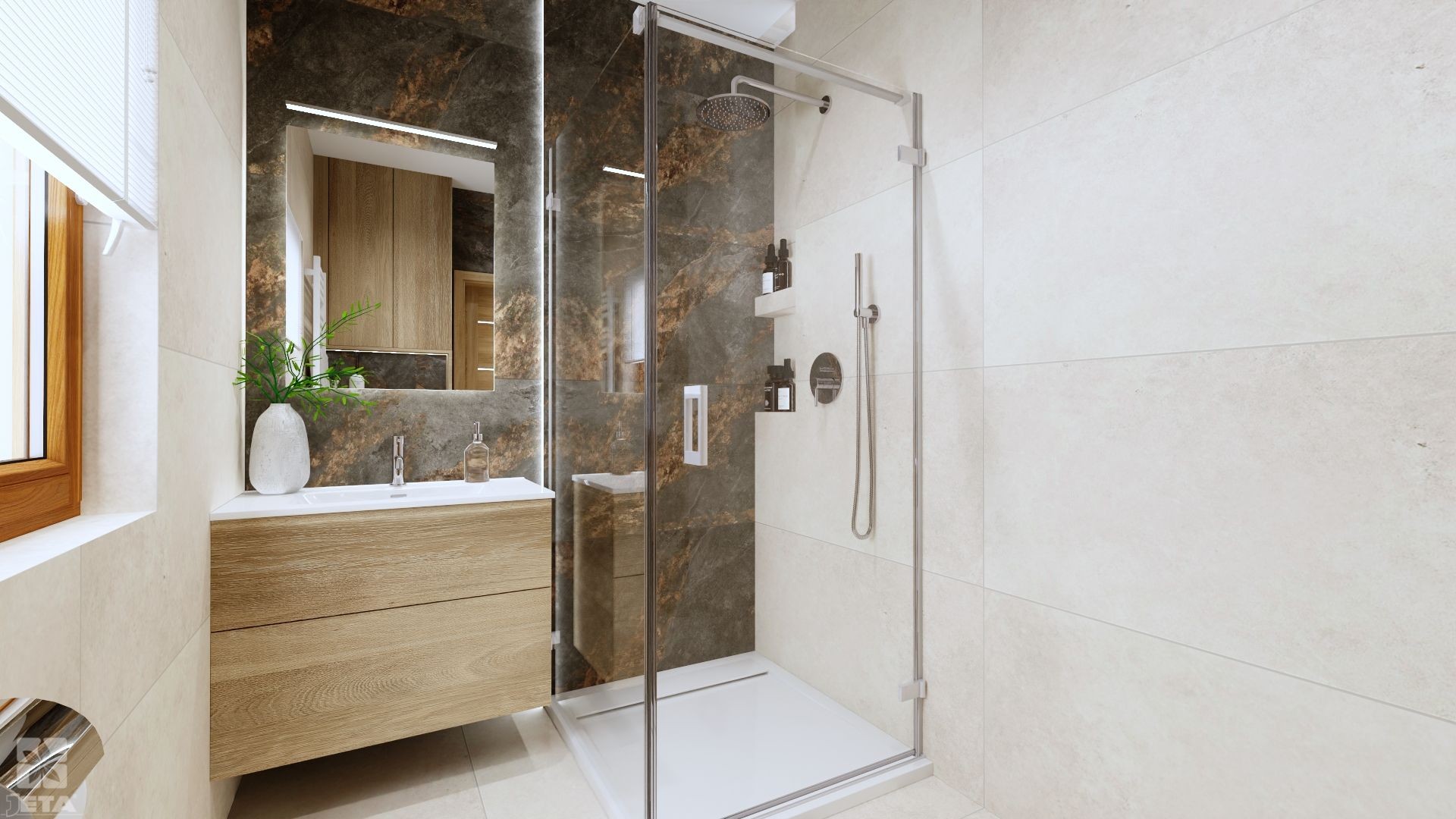 Nowoczesna łazienka w stylu naturalnym łączy elegancję z ciepłem drewna i szlachetnym kamieniem. Ściany pokryte wielkoformatowymi płytkami o beżowej strukturze subtelnie kontrastują z akcentami w postaci dekoracyjnego gresu imitującego marmur w ciemnych odcieniach. Podwieszana szafka umywalkowa z jasnego drewna dodaje wnętrzu lekkości, a duże lustro z podświetleniem LED optycznie powiększa przestrzeń. Przeszklona kabina prysznicowa z minimalistyczną armaturą podkreśla nowoczesny charakter wnętrza. Całość dopełniają delikatne akcenty roślinne, które wprowadzają przytulny i relaksujący klimat.