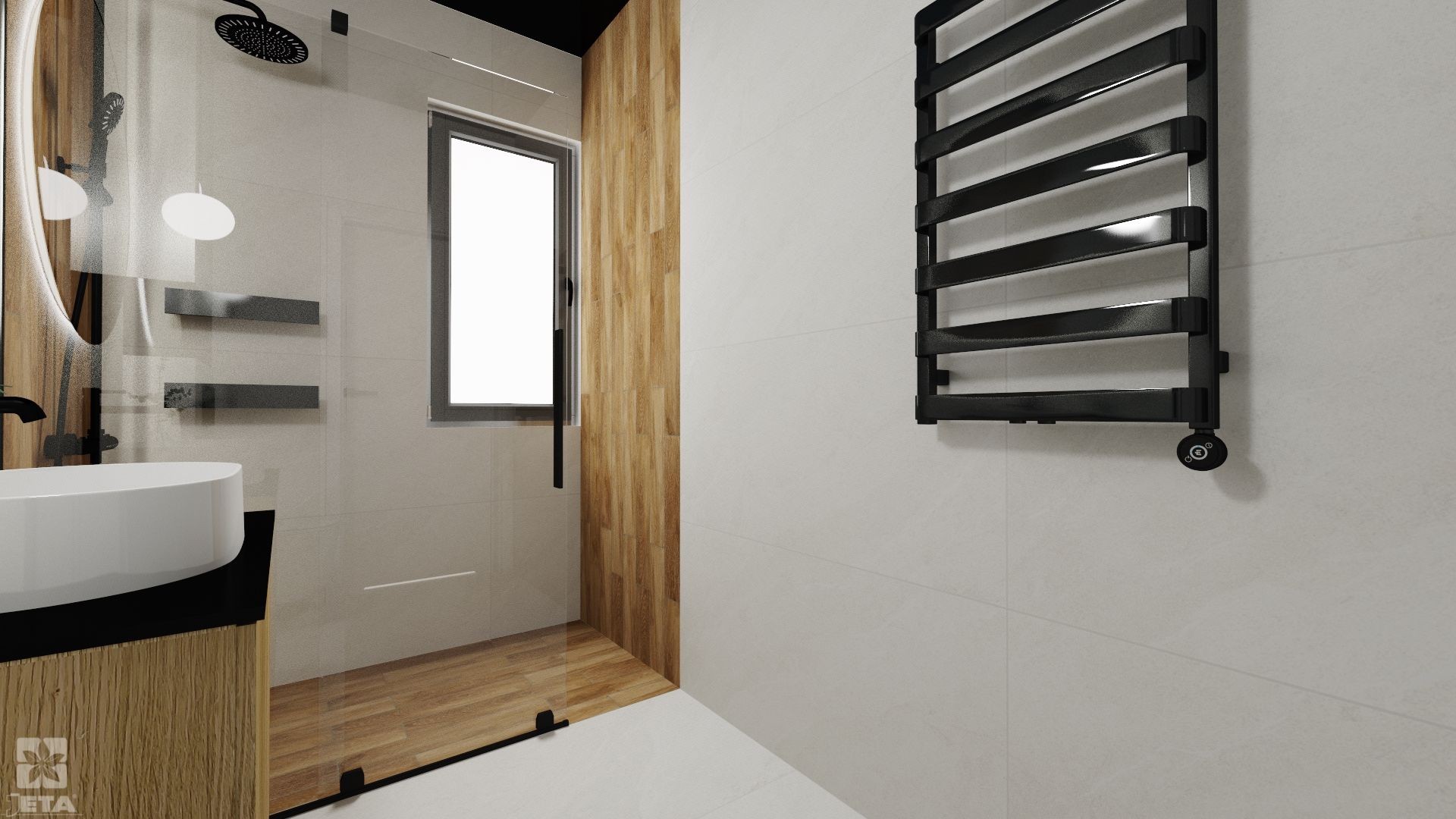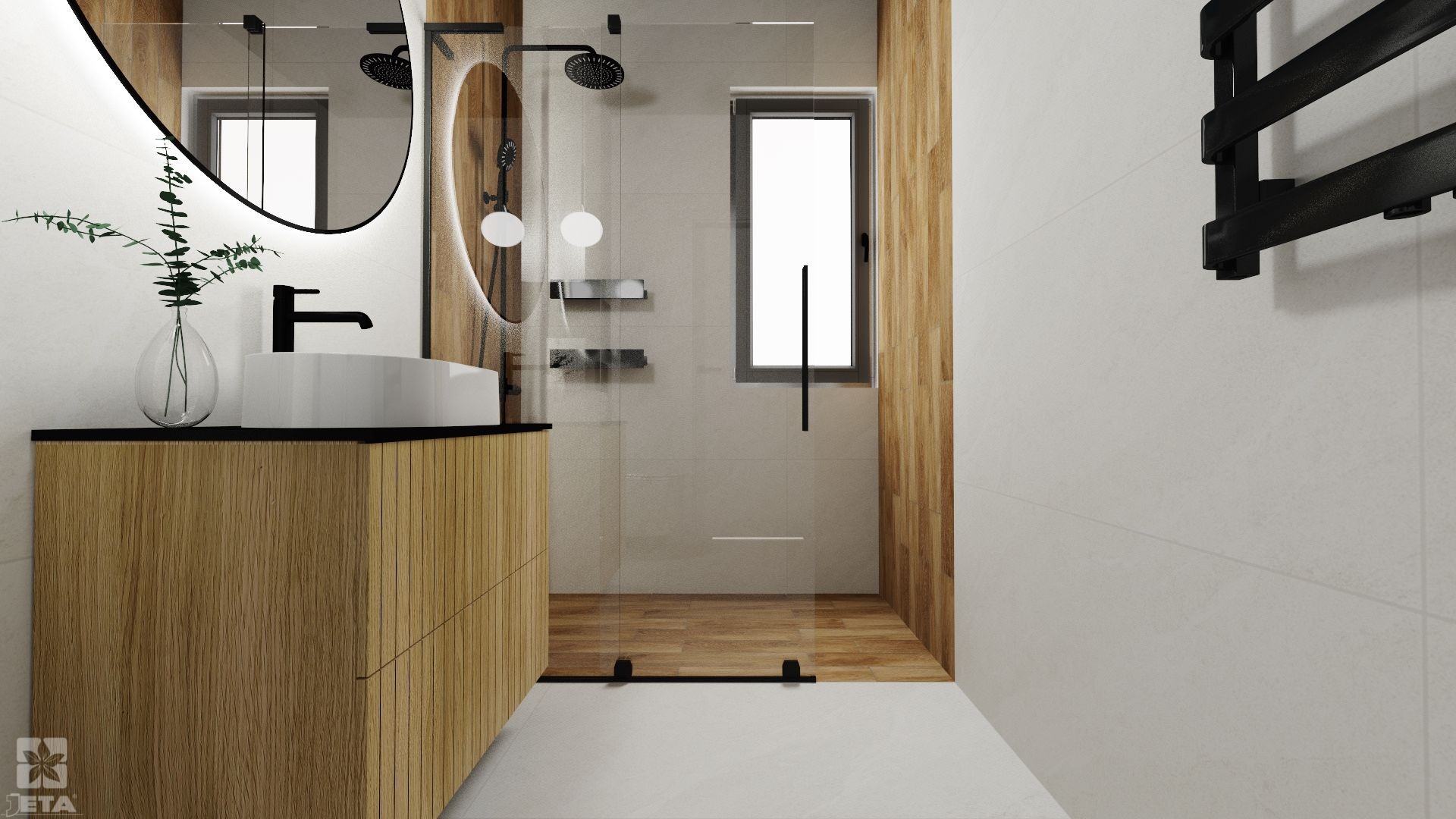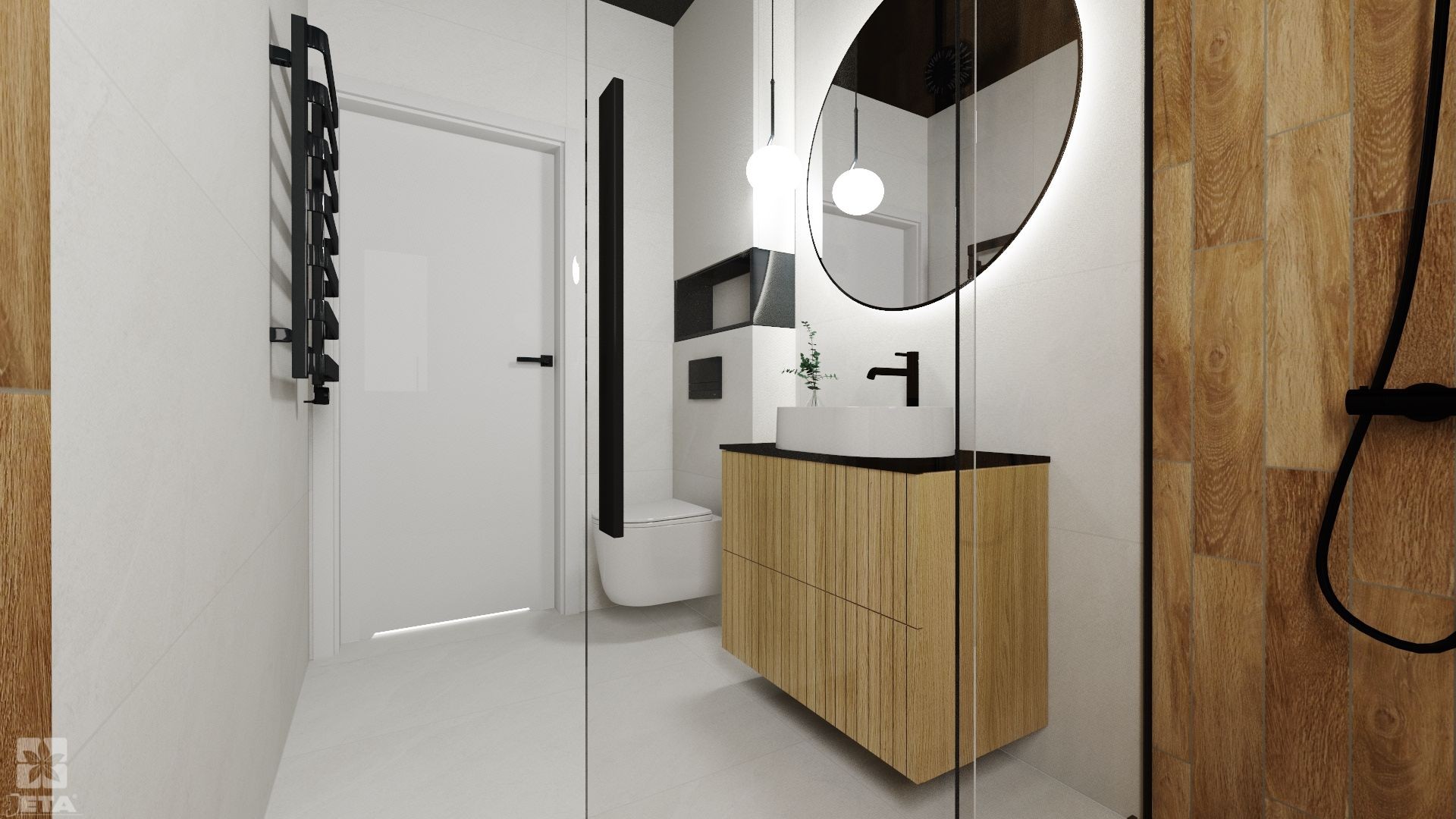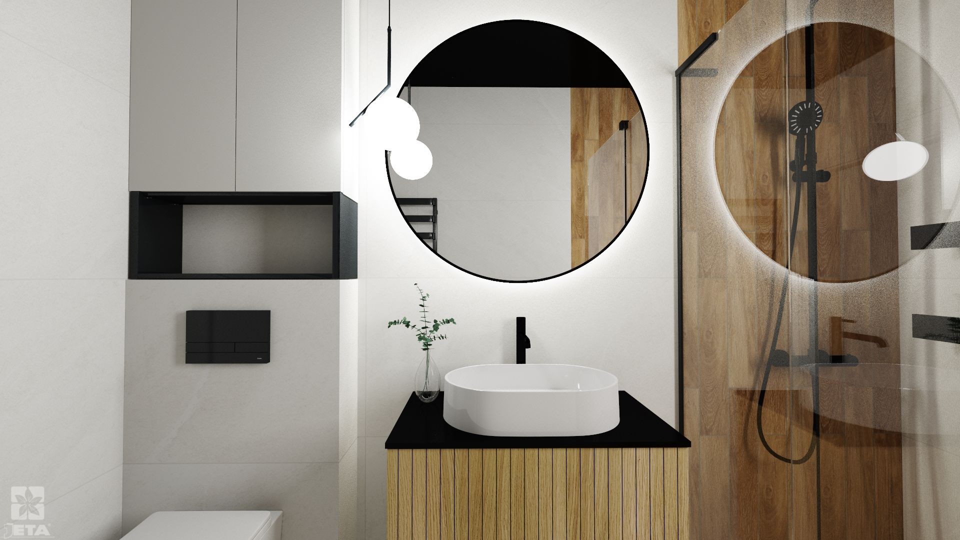 Harmonia naturalnych materiałów i minimalistycznego designu. Ciepłe odcienie drewna współgrają z czernią armatury, tworząc wyrafinowaną i ponadczasową przestrzeń. Geometryczne kształty, duże lustro z podświetleniem i przeszklony prysznic optycznie powiększają wnętrze, dodając mu lekkości. Styl skandynawski łączy funkcjonalność z estetyką, oferując komfort i przytulność. Proste formy i przemyślane detale sprawiają, że aranżacja zachwyca nowoczesnym charakterem. Inspiracja dla osób ceniących minimalizm w eleganckim wydaniu.