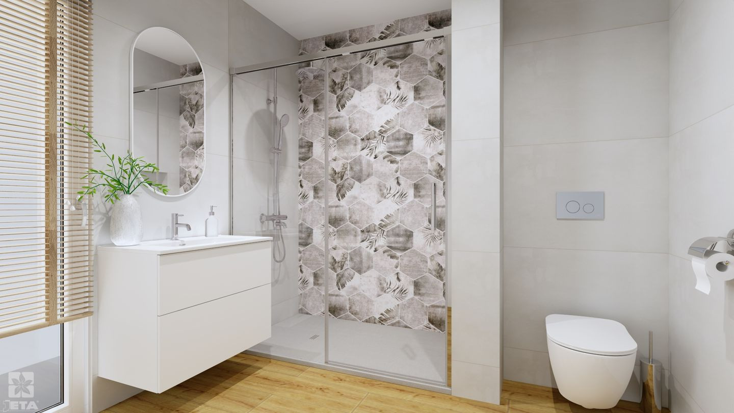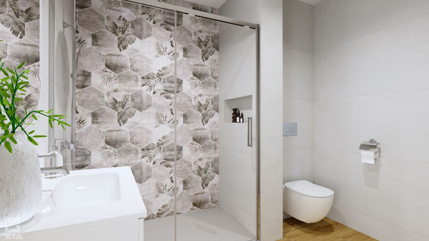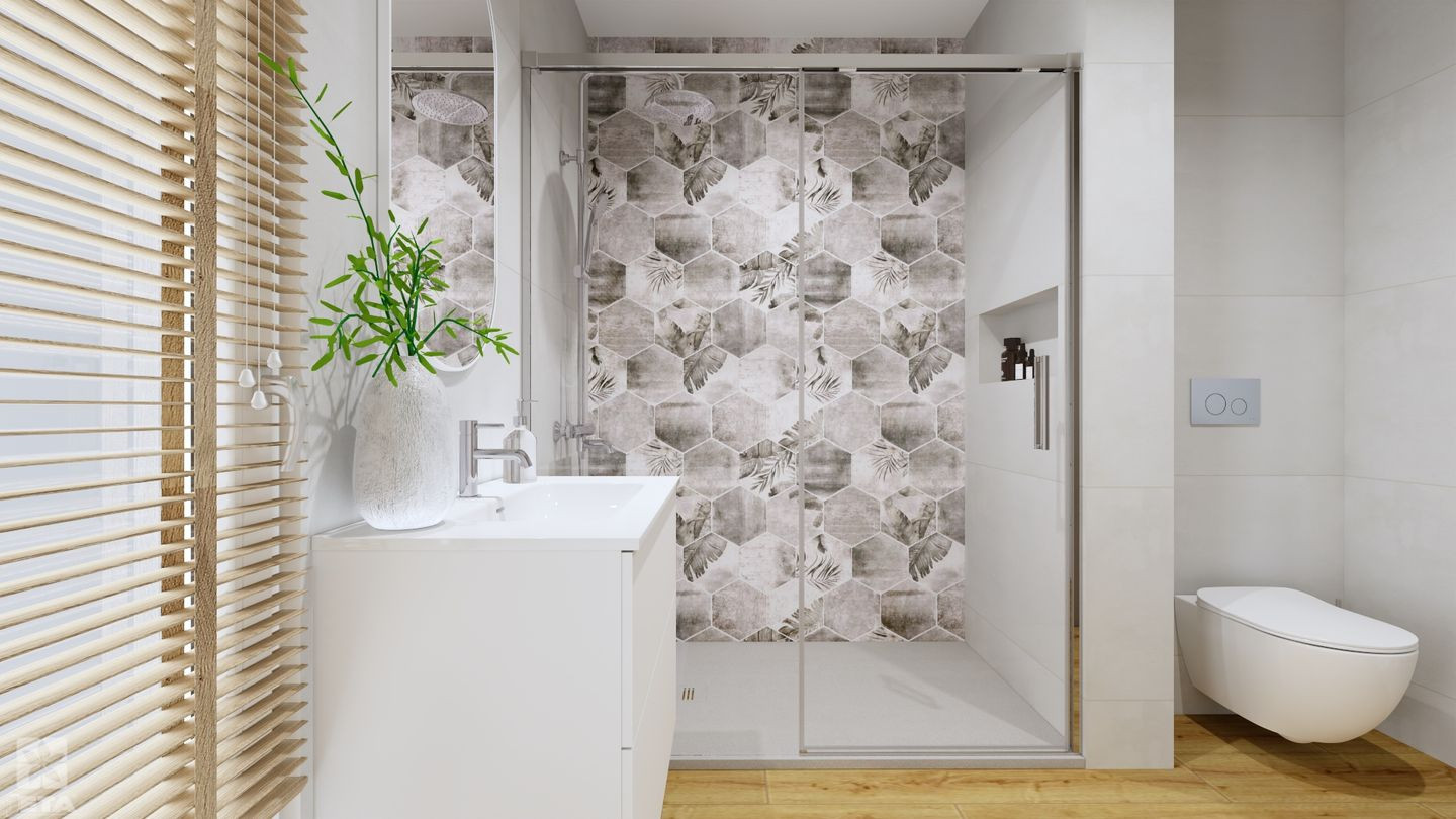 Szukasz pomysłu na jasną, funkcjonalną łazienkę, która optycznie powiększa przestrzeń i sprawdzi się na co dzień? Ta aranżacja łączy estetykę stylu skandynawskiego z praktycznymi rozwiązaniami do mniejszych wnętrz. Jasne, gładkie płytki stanowią bazę, a płytki drewnopodobne ocieplają całość i wprowadzają naturalny klimat. Dekoracyjne heksagony z subtelnym motywem roślinnym dodają charakteru, nie przytłaczając przestrzeni.